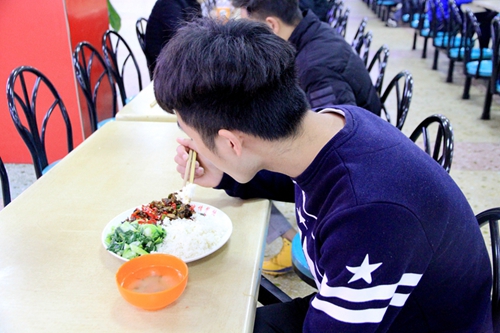 4月11日中午,来自湖南城步苗族自治县的李俊在食堂用餐