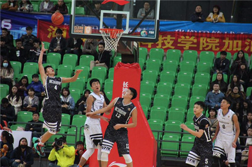 男篮决赛则在我院与老对手长沙民政之间展开。比赛开局第一节我院以1比9落后,球员们奋力追分,但是首节结束时最大分差被拉到12分,开局的不利让队员和教练员心中都万分焦急。见此情况,教练员暂停比赛并调整比赛战略,在第二节时对民政学院发起猛攻,吹响追分的号角。通过加大防守强度,针对对方实际情况改变我方的进攻方式,在全队齐心协力下,在上半场结束时将比分追至仅相差1分。下半场比赛中,两队比分交替领先,进入白热化,双方观众高喊加油,球员奋力追分,但在关键时刻,对手连续命中两记三分球,使得分差再次被拉大。时间所剩无几,比分难以追回,但球员们没有放弃,继续奋战,最终以4分惜败,夺得比赛亚军,并拿到全国赛入场券。