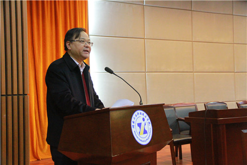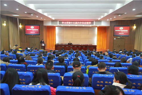 本网讯 11月22日下午,我院在图书馆多功能报告厅举行党委中心组学习扩大会。学院全体院领导、中层干部、总支委员、支部书记、团总支书记、辅导员、思政部教师、党务部门教职工、教师及学生党员代表等共300余人参会,共同学习贯彻十八届六中全会精神。学习会由学院党委副书记陈超主持。