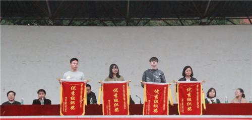 邓建国宣读团体竞赛成绩和优秀组织奖评选结果:在学生比赛中,获得优秀组织奖的系(院)分别是商贸旅游系、现代设计艺术系、信息工程系以及电气工程系,机械工程系、经济管理系、汽车工程学院分别获得团队总分冠、亚、季军。在教职工比赛中,优秀组织奖由经济管理系分工会获得,道德风尚奖由信息继教机关一分工会获得,团体总分冠、亚、季军分别是机械工程系分工会、艺术后勤分工会、电气工程系分工会。