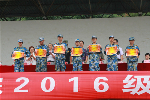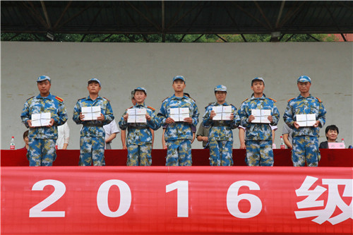 学院党委副书记陈超宣读《yabocom(中国)官方网站2016级新生军训表彰决定》,授予杨曦等19人“军训优秀教官”称号,授予一营一连等18个连队“优秀连队”称号,授予肖小杰等260名同学“军训优秀个人”称号。主席台领导、嘉宾们为获奖集体和个人进行了颁奖。