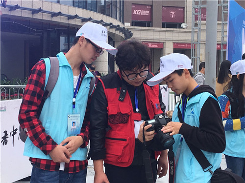 影像组志愿者在新华网记者指导下拍照