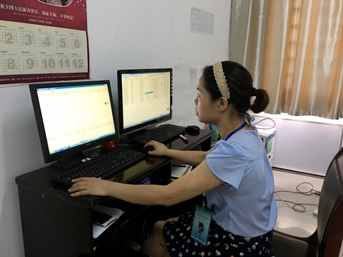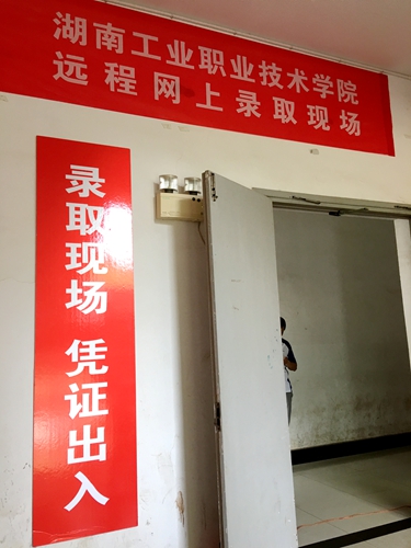 8月10日上午9时,招生录取工作现场,工作人员向学院招生录取领导工作小组副组长、副院长邓建国(中)介绍录取工作情况