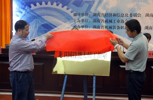 随后,我院院长刘建湘与省劳模、中联重科股份有限公司高级技师龙卫国,湖南机电职业技术学院副院长任丕顺与全国劳模、湖南华菱湘潭钢铁有限公司高级技师艾爱国共同为已确定建设的技能大师工作室代表——“龙卫国技能大师工作室”、“艾爱国技能大师工作室”揭牌。