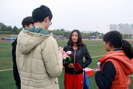 经济管理系物流S13-1班陈春花同学获得女子三级跳远冠军。在接受学生记者采访时,她还介绍了跳远比赛的技巧。她说:“因为赛前经常训练,准备充分,我对本次比赛夺冠充满信心,虽然天气寒冷,但并没有影响我比赛的状态。”据悉,陈春花同学已连续两年获得我院校运会三级跳远冠军,且在2014年省运会上获得过跳远比赛第三名。