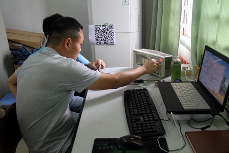 邓敏敏同学负责装器件,肖震宇同学负责做线,谭庄同学负责程序调试,一切秩序井然。一个多月从早到晚的集训和练习,让他们在实践操作中获得了比课堂上更大的收获。
