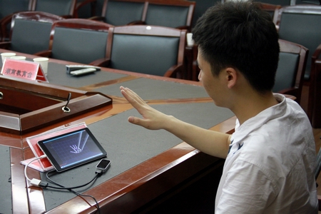 张江杰为媒体记者演示“哑语转换系统”操作过程