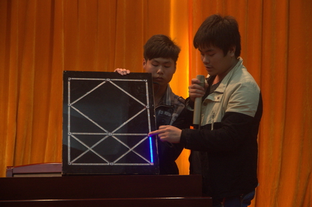 大赛中每组参赛选手都拿出了自己的优秀作品。张江杰团队带来的一种以分散式废弃热源为能源的分布式发电单元是由设备结构外燃机及温差发电片、稳压及电力存储、升压逆变输出三部分组成,具有科学性、创新性、实用性的特点,而且该发明已被中国发明协会选中,将代表中国参加2015法国巴黎发明国际博展会。莫海军团队带来的智力一笔画实现了从软件到游戏的蜕变,他们当场给大家演示了游戏的运行。它是以电池供电,游戏中的每一条线路都不能重复去走,而且游戏图案可以自行修改,趣味性十足。彭涛团队的作品是校园二手品交易平台,意在打造一个资源循环平台,联合中小学、高中和大学校园创建校内和校外平台,让资源能得到最大程度的利用。专家评委建议把该团队把依托平台解释清楚,并且找准市场定位,确立主打市场,从而促进发展。游方东团队申报的项目是一款采用超级电容供电的照明手电,通过与普通电池的比较,凸现了超级电容供电快速安全环保等特点,团队还现场演示了用超级电容供电的照明手电的使用,专家表示,要得出该发明与其他普通电池的区别优势还要多做实验,就目前该团队所做实验次数得出的数据还远远不足证明,但创意值得肯定。除此之外,还有李飞团队的多功能制图仪、罗楠团队的多功能画板、宁琴香团队的雾霾过滤器、李昶团队的校园物流平台、潘辉团队的“托盘之家”运营项目、谭媛媛团队的“二手汽车港”运营项目和杨金桥团队的老好人品牌商业运作模式。新颖独特的科技创新成果和创意赢得了评委的一致好评和在场观众的阵阵掌声。