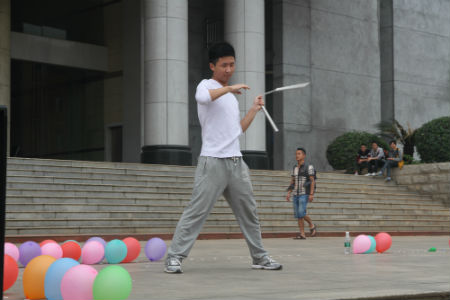 各社团在校园主道上摆台迎新,并开展各种活动,吸引了许多单招考生驻足观看并参与:天心阁文学社设置字谜给考生猜,展示汉字的独特魅力;书法协会成员现场挥墨,并将书法作品赠送给感兴趣的学生;曳舞协会带来酷炫的舞步,并邀请考生参与,带他们一起表演简单的舞步;双截棍协会用双截棍准确无误的击破气球,引来一片叫好声。
