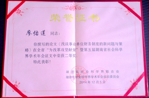 本网讯 12月15日,全省“为改革攻坚献策”研究成果交流会暨第五届湖南省社会科学界学术年会在长沙召开,共有30篇优秀“金点子”作品和160篇学术论文被表彰。我院财务处副处长廖佑莲老师应邀参加会议,其作品《浅谈事业单位财务制度的新问题与策略》获本次论文征集二等奖。近年来,我院青年教师社科研究的问题导向意识进一步强化,青年教师的理论应用助推地方经济发展的话语权进一步增强。