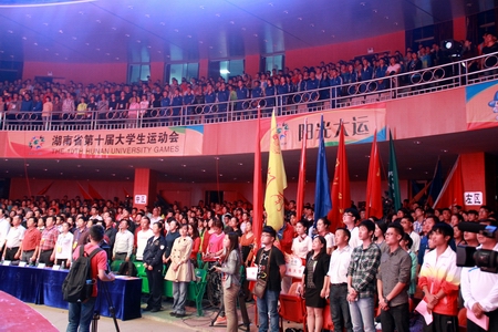 湖南省第十届大学生运动会组织委员会执行主任、长沙民政职业技术学院党委副书记李斌致欢迎词,大运会田径比赛赞助单位代表、中国建设银行长沙天心支行副行长胡宗红致贺词,湖南省大学生运动会组织委员会执行主任、湖南省教育厅体育卫生与艺术教育处处长符润中致开幕词,湖南省政协副主席、长沙民政职业技术学院校长刘晓宣布湖南省第十届大学生运动会田径比赛开幕。我院男女田径代表队参加了开幕式。