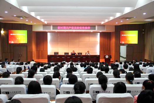 本网讯 10月17日晚,学院党委书记熊琦就“新时期共产党员的党性修养”这一主题在图书馆报告厅进行党课讲授。各党总支书记、党支部书记、师生党员代表、党员发展对象、全体辅导员及学生干事近300余人到场聆听。党委副书记周立华主持报告会。