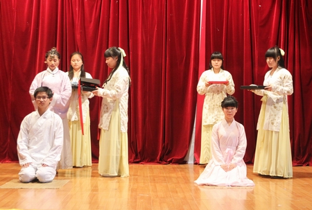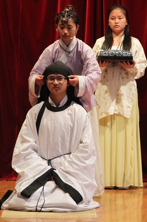 冠礼,是在男子成人之际(古代为十五岁至二十岁)举行的束发簪缨,加冠服的仪式;笄礼,是在女子成人之际(古代为十五岁)举行的束发加笄,加正服的仪式。通过这种仪式,宣示他们正式告别“孺子”的身份,获得了成人的资格,可以参与社会中的一切事宜,同时承担成年人需要承担的一切义务。冠(笄)者在庄重的仪式中涤盥了身心,加深了他们的社会责任感和对华夏文明的认同感。