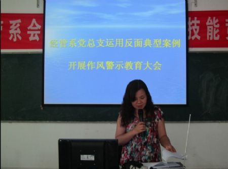 为认真贯彻落实学院作风建设工作会议精神,按照学院《关于加强作风建设推进学院内涵建设的实施方案》、《关于运用反面典型案例开展作风警示教育的通知》等文件要求,根据学院统一安排,9月17日下午,我院各系(院)、处、部门、党总支分别召开了作风警示教育学习讨论会。