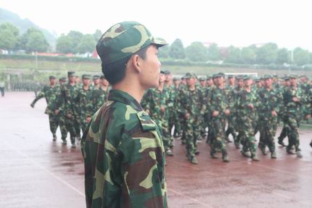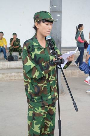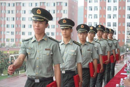 庄严的升旗仪式后,院长刘建湘在阅兵指挥员的陪同下检阅新兵。 “同学们好!”“首长好!”“同学们辛苦了!”“为人民服务!”4千多名新生响亮的回答,汇成一支高亢的乐曲在田径场上空盘旋。