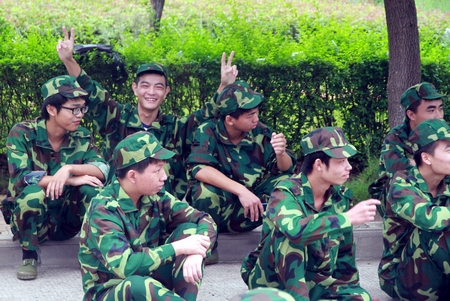 短暂的休息时间,新生们按照队列位置席地而坐。教官给大家讲军营趣事,教大家唱军歌,唱到动情处,一些女生开始想家,眼角湿润。可是一旦两个连队开始拉歌,女生们又会马上振作起来,使出浑身力气,为自己的集体争取更大胜数。训练场上到处飞扬着歌声、笑声、鼓掌声、呐喊声,一排排的迷彩绿成为校园里最独特的风景线。