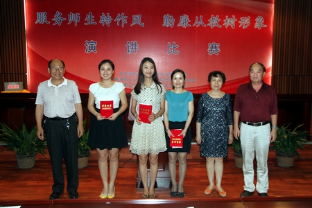 6月27日下午,由院党委、院纪委、院工会共同主办的“服务师生转作风,勤廉从教树形象”演讲比赛决赛在图书馆报告厅隆重举行。党委书记龙承海、院长刘建湘等全体院领导及各党总支师生前来观摩比赛。比赛全程由商贸旅游系沈飞跃老师、经济管理系李可丁老师主持,评委团由来自各党总支的相关工作人员组成。