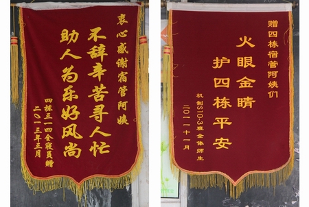 险些被偷的四栋314寝室同学们制作了一面锦旗——“不辞辛苦寻人忙,助人为乐好风尚”,以此向程秋玲等老师表示谢意。面对同学们的感谢,程老师认为,名利都是其次,重要的是保护好学生的生命、财产安全,这是职责所在。她笑着对记者说:“你一进门我就知道你不是我们四栋的学生。”程老师等宿管老师们在工作中的高度警惕性可见一斑。