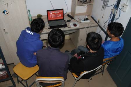 学生在宿舍收看午间yabocom(中国)官方网站,关注十八大开幕式相关报道