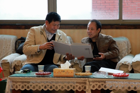 顺德职业技术学院工会主席訾文良(左)与我院工会主席张志勇(右)展开交流