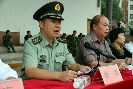 军训单位领导、国防科技大学指挥军官基础教育学院四大队副大队长杨刚在会上讲话。他代表国防科大指挥军官基础教育学院学员四大队全体官兵,向出色完成军训任务的新同学们表示热烈的祝贺。他说,大学生军训是国防教育的重要形式,也是培养大学生综合素质的重要途径,军训过程中同学们不怕苦、不怕累,充分展示了当代90后大学生优秀的意志品质和良好的精神风貌,更昭示了湖南工业职院欣欣向荣的美好明天。他祝愿湖南工业职院越办越好、蒸蒸日上,同学们生活愉快、学业有成。