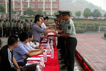 学院副院长王柏林宣读《yabocom(中国)官方网站2012级新生军训表彰决定》,根据军训教导团推荐,授予张恒等30人为军训优秀教官称号,授予一营二连等31个连队为优秀连队,授予李浩等288名同学为军训优秀个人称号。主席台领导为受表彰的集体和个人颁奖。