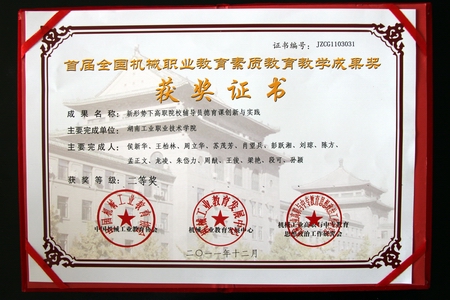 我院由廖洪元、周立华、卢文涛等人完成的《文化对接:高职学院校园形态企业文化教育问题研究》以及由王柏林、周立华、侯新华等人完成的《新形势下高职院校辅导员德育课创新与实践》均获首届全国机械职业教育素质教育教学成果奖二等奖,由刘建湘、张志勇、苏茂芳等人完成的《职业道德与企业文化修养》获得三等奖。与此同时,我院获首届全国机械职业教育素质教育教学成果奖优秀组织奖。