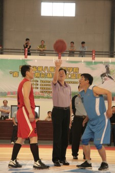 湖南省体育局副局长、湖南省篮球协会主席杨再辉先生宣布本次大赛开幕,并为教育厅机关队与高职院校联队表演赛开球。