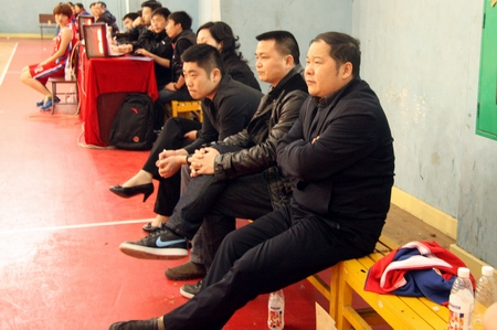 学院院长刘建湘(右一)现场观看比赛并为女篮姑娘们加油鼓劲