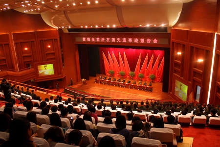 3月29日下午,由中宣部、解放军总政治部、共青团中央和辽宁省委联合举办的雷锋生前所在团先进事迹报告会在长沙人民会堂举行,广州军区机关、省军区机关、长沙警备区及驻湘部队和社会各界人士共1300人参加了报告会。