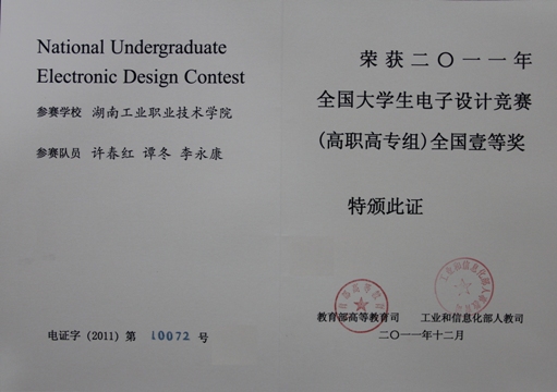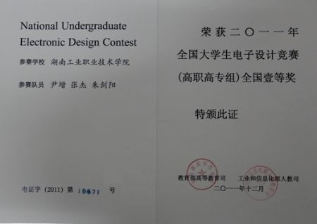 全国大学生电子设计竞赛是教育部高教司、工业和信息化部人教司共同主办的全国性大学生科技竞赛活动,是教育部倡导的四大学科竞赛之一,同时也是目前我国电子学科类举办时间最长、实施范围最广、参赛学校最多、影响最大的大学生基础学科竞赛。其主要特点是理论联系实际,竞赛内容既有理论分析,又有实际制作。本届竞赛吸引了全国1000余所高校、33000余学生参与。我院代表湖南赛区参赛的电气工程系2个参赛队(张杰、 尹增、朱剑阳——G题;谭冬、许春红、李永康——H题)均获得了一等奖的好成绩。此前,我院代表队在湖南赛区获得两个一等奖、两个二等奖和一个三等奖的优异成绩,是所有参赛的高职院校中唯一获得两项一等奖的代表队。