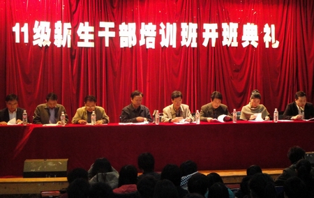 11月7日晚,我院“2011级新生干部培训班开班典礼”在大学生活动中心隆重举行。院党委副书记周立华,院党校副校长陈方,学生工作处、团委以及各系相关负责人出席了开班典礼。典礼由团委书记段可主持。
