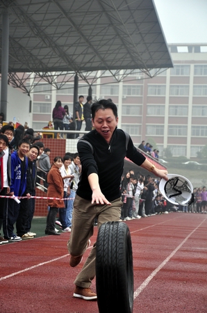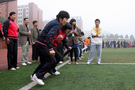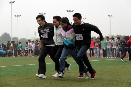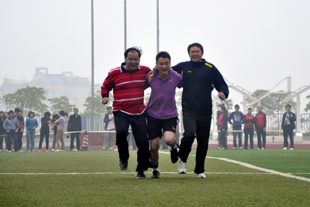 我院院长刘建湘(左一)参加趣味运动会“三人四足”比赛 与教职员工们一起快乐奔跑