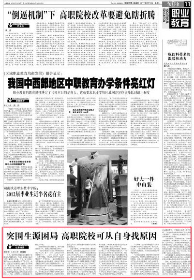 9月19日,《中国青年报》以《突围生源困局 高职院校可从自身找原因》为题,报道了我院依靠湖南省的三大支柱产业之一——机械装备制造业,找准湖南机械装备制造业高技能人才输送和培训基地的定位,针对市场需求、改革人才培养模式、加强内涵建设、提高办学质量、搭建校企合作新平台,在今年高职生源整体“缩水”的形势下招生火爆的情况。人民网、凤凰网、和讯网等多家网络媒体转载了该篇报道。