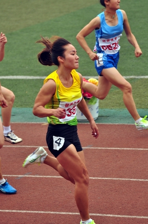 我院运动员刘媛媛在女子100米决赛中象女飞人一样冲过终点