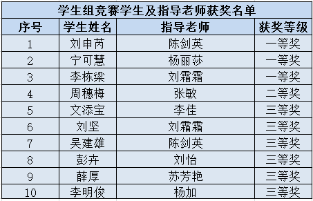 11月12日,由湖南省教育厅主办的2021年湖南省高职高专院校信息素养大赛结果揭晓,我校代表队在本次大赛中取得优异成绩。易宣辰老师获得教师组大赛微课一等奖、王玮璐老师获三等奖;学生组共10名同学获奖,其中刘申芮、宁可慧和李栋梁获得一等奖,周穗梅获得二等奖,文添宝、刘坚、吴建雄、彭卉、薛厚和李明俊获得三等奖;同时,我校荣获团体优秀组织奖。(获奖名单附后)