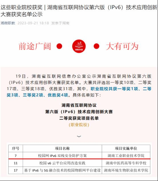 近日,2023年湖南省互联网协议第六版(IPv6)技术应用创新大赛在长沙落下帷幕,我校参赛作品《校园网IPv6双栈安全防护方案》荣获二等奖,这是我校在信息化建设方面的又一次重要成果。