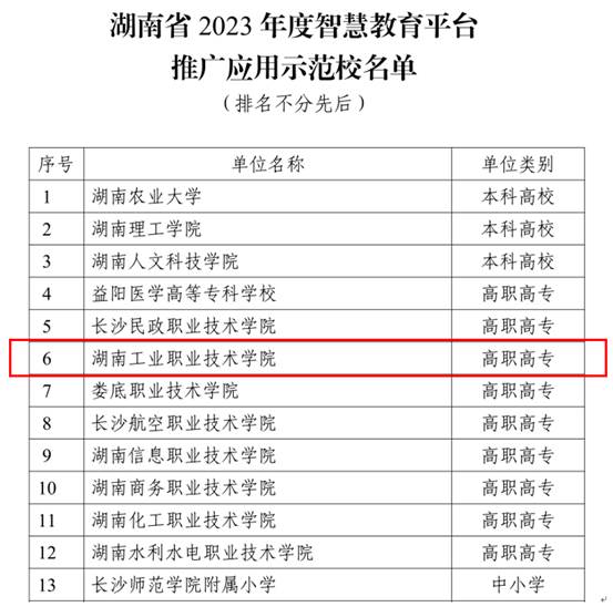 近日,湖南省教育厅公布了全省2023年度智慧教育平台推广应用示范校评选结果,共评选出100所湖南省2023年度智慧教育平台推广应用示范校,包括本科高校3所、高职院校9所、中小学88所,我校成功获评为湖南省2023年度智慧教育平台推广应用示范校。