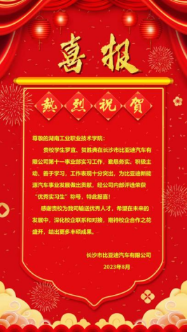 8月9日,长沙比亚迪汽车有限公司向我校发来喜报,汽车工程学院汽运2020-1班罗宜,模具2020-2班贺胜典,荣获“优秀实习生”荣誉称号。