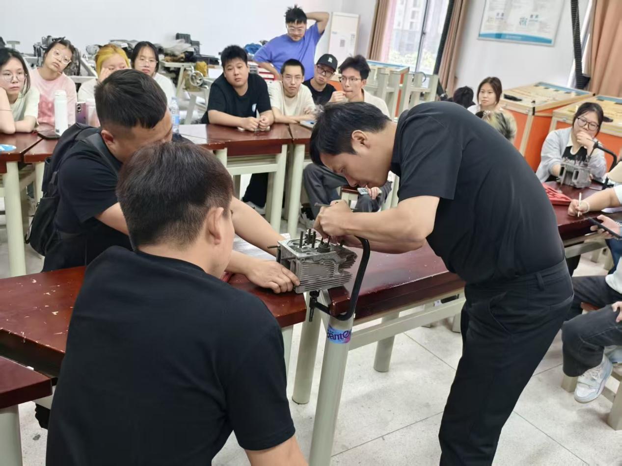 大赛分赛前培训与实操拆装两大环节。在赛前培训环节,经验丰富的刘凯老师针对核心部件气门,开展了理论与实操结合的细致讲解与演练。他从气门拆卸顺序的精准步骤,到安装时的间隙调整要点,再到密封处理、部件磨损检测等关键技术细节,都讲解得非常细致。参训学生通过反复模拟练习,熟练掌握了气门组的拆装规范,为正式比赛筑牢技能根基。