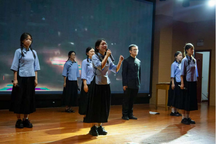 班长李湘怡介绍:“在汤老师的指导下,我们将“严谨细致”的专业底色注入艺术创作,从台词情感的精准拿捏,到舞台走位的精心调整,历经数十次打磨,力求让每一个音节都饱含对历史的敬畏。”比赛中,选手们以整齐的台风、层次丰富的情感表达,生动诠释了“工科学子不仅能握扳手,更能以声音传递家国情怀”的精神风貌,赢得评委与观众的热烈掌声。