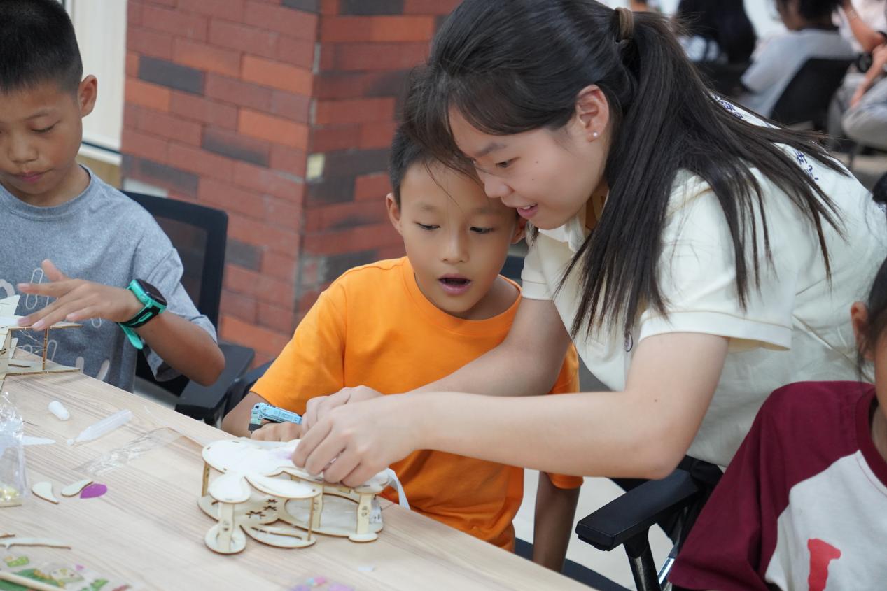 志愿者教小朋友完成手工作品
