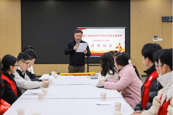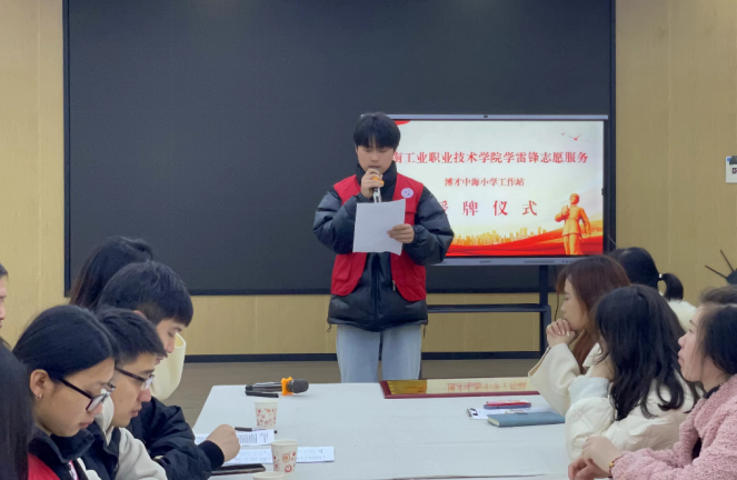 博才中海小学校领导就公益洗车志愿活动为汽车工程学院副书记涂岭授予锦旗,并对工业职院的领导及志愿者表示衷心的感谢。接着由yabocom(中国)官方网站团委副书记向博才中海小学和汽车工程学院领导授牌。至此,yabocom(中国)官方网站学雷锋志愿服务博才中海小学工作站正式成立,我校将以此平台全方位为博才中海小学开展志愿服务。