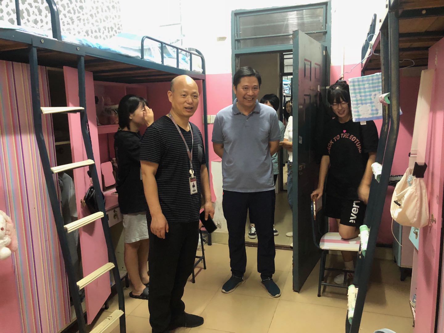 9月13日是商务贸易学院学生新学期报到后第一天,商务贸易学院院长申奇志、党总支书记杨学文、办公室主任夏利平以及学院辅导员一同走访学生宿舍,慰问2021级新生。
