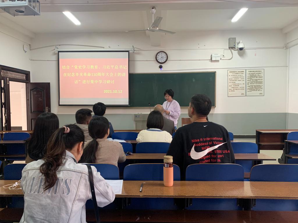 结合党史学习教育、习近平总书记在纪念辛亥革命110周年大会上的讲话和高等学校消防安全管理规定进行,10月12日下午,商务贸易学院党总支在2213教室开展主题教育二级中心组集中学习研讨。学院领导、党支部书记、办公室主任、教研室主任等相关科级干部参加了会议。会议由党总支委员夏利平主讲。