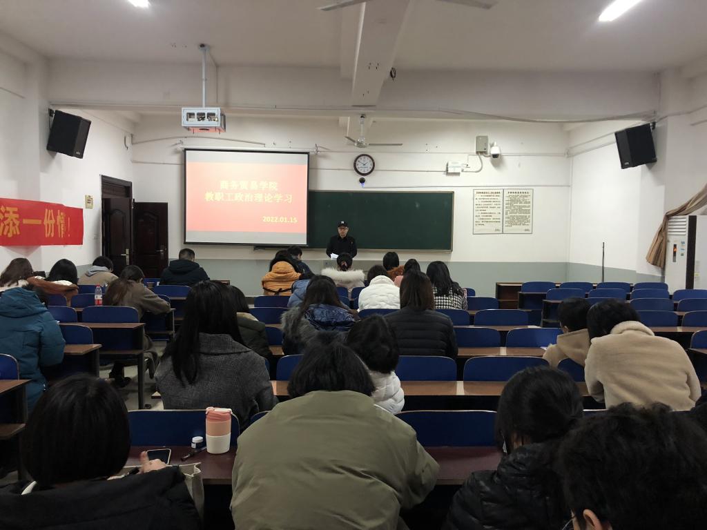 1月15日下午,商务贸易学院全体教职员工在2213教室开展了2022年1-2月政治理论集中学习,会议由学院党总支书记杨学文主持。