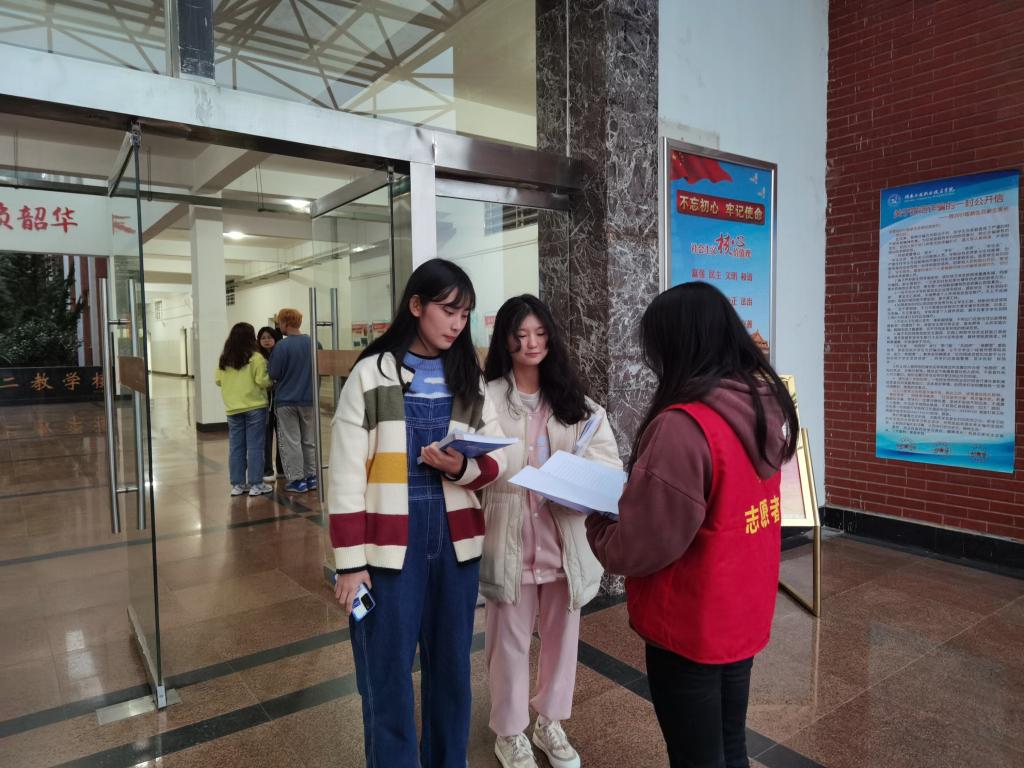 3月2日社团青协部的志愿者在教学楼与学生公寓门口宣传学习雷锋系列活动。通过志愿者的宣传,不少同学表示对活动有浓厚的兴趣,并且会参与到雷锋月志愿活动中来。