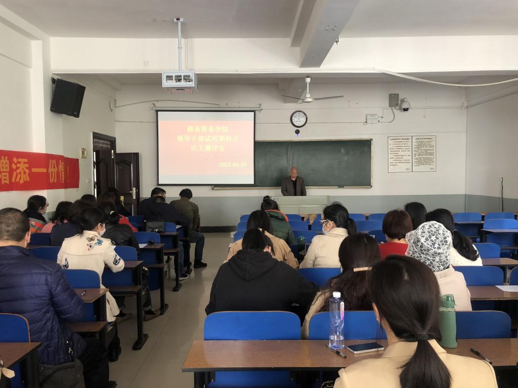 4月19日下午,商务贸易学院在2213召开新提任领导干部试用期满考核测评大会,学院全体教师针对被考核人的德、能、勤、绩廉等各个方面展开不记名测评。