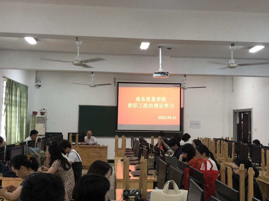 6月21日下午,商务贸易学院全体教职员工在5407教室开展了2022年6月政治理论集中学习,会议由学院党总支书记杨学文主持。
