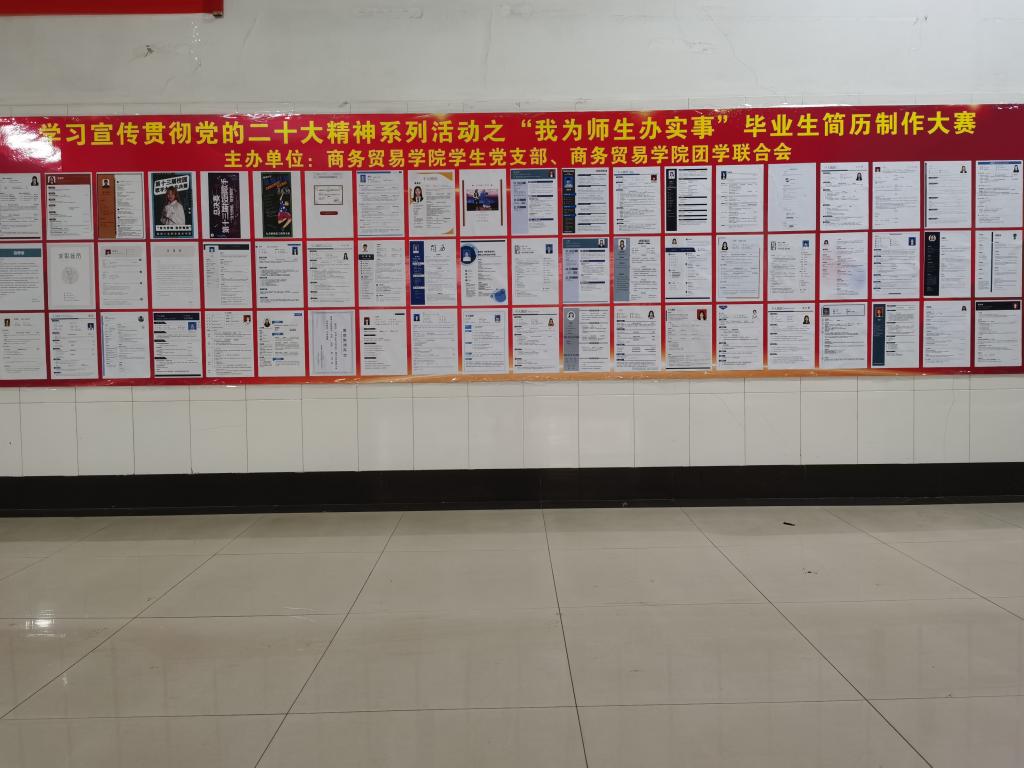 商务贸易学院党总支为贯彻落实学校党委《关于深入学习宣传贯彻党的二十大精神的通知》精神,开展创新服务实践活动,解决毕业生在疫情影响下急难愁盼的就业问题,特在11月24日-12月24日组织开展为期一个月的“我为师生办实事”系列活动之毕业生简历制作大赛,提高毕业生简历制作水平,提升就业能力。